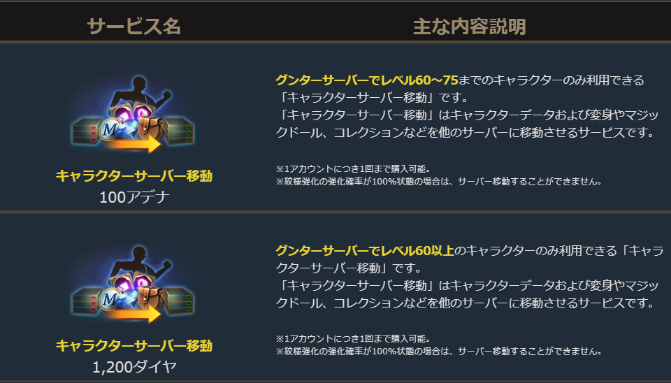 「キャラクターサーバー移動」は2種類あり、100アデナで移動できるサービスと、1200ダイヤで移動できる商品がございます。