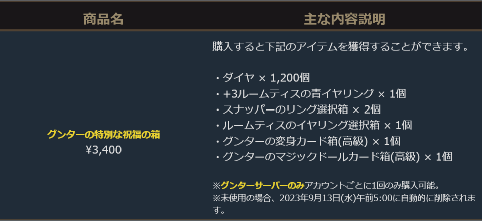 期間限定育成サーバー「グンター」限定のパッケージとして「グンターの特別な祝福の箱」を販売開始しました。