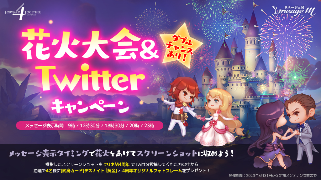 感謝のメッセージが流れているタイミングで花火を打ち上げて4周年をお祝いしているスクリーンショットを撮影し、ハッシュタグ「#リネM4周年」をつけてTwitterへ投稿しましょう!