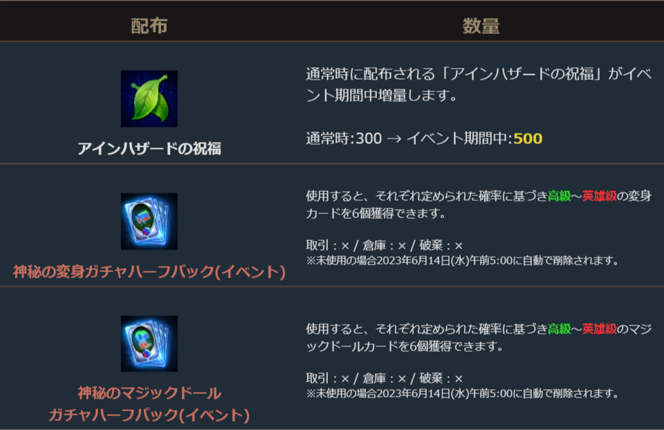 イベント期間中、毎日配布される「ピクシーの贈り物」から獲得できる「アインハザードの祝福」が300から500に増量します。