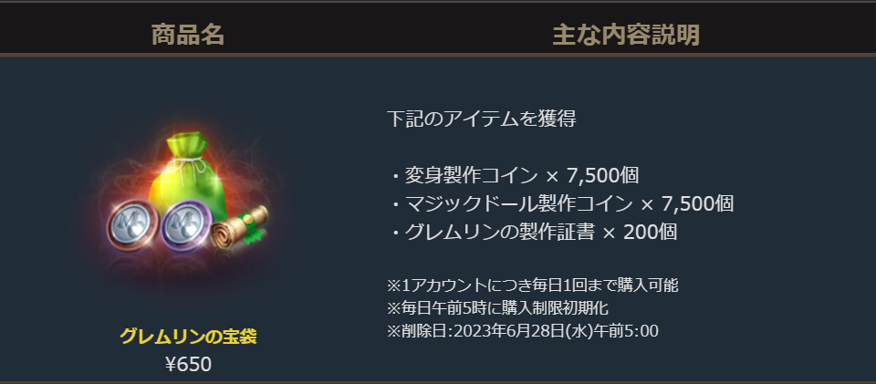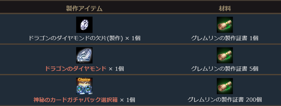 「変身製作コイン」「マジックドール製作コイン」と一緒に「ドラゴンのダイヤモンド」か「ドラゴンのダイヤモンドの欠片(製作)」や新たに「神秘のカードガチャパック選択箱」の製作材料となる「グレムリンの製作証書」が手に入る、毎日購入可能なお得なパッケージです。