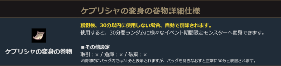 「ケプリシャの変身の巻物」は、イベント期間限定変身を行うことができますが、使用するまで何に変身するか判りません。