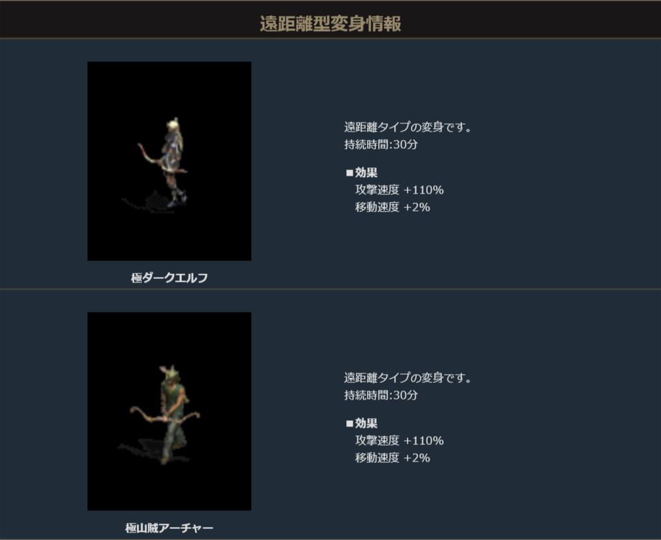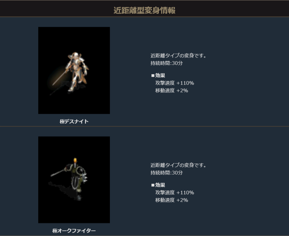 武器が着用できない変身もあるため、村の中で変身確認後に狩場へ移動することをおすすめします。