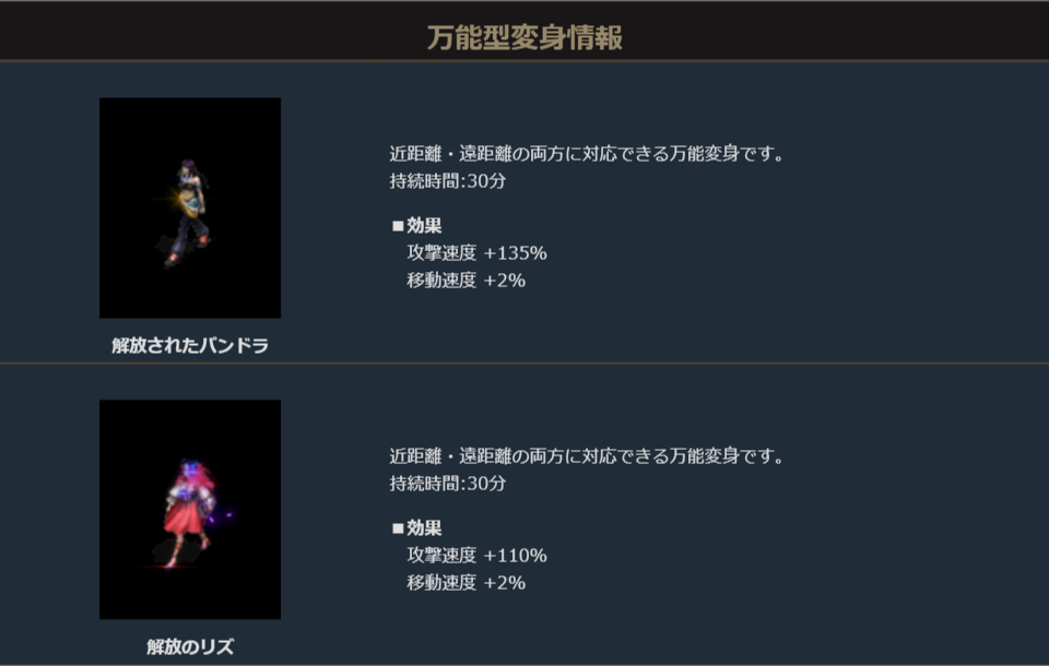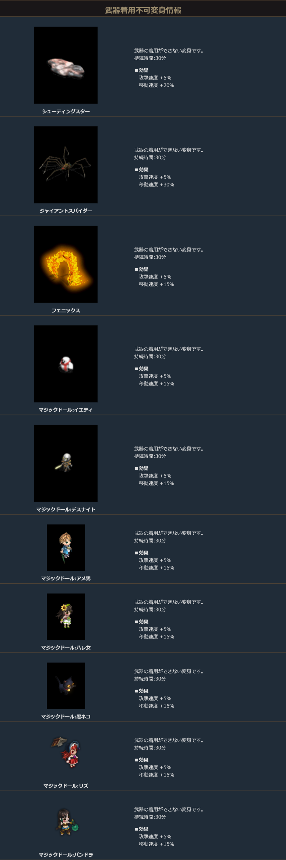 攻撃速度が上昇する変身や、武器の着用が不可能な面白変身などランダムに様々なモンスターへ変身できます。