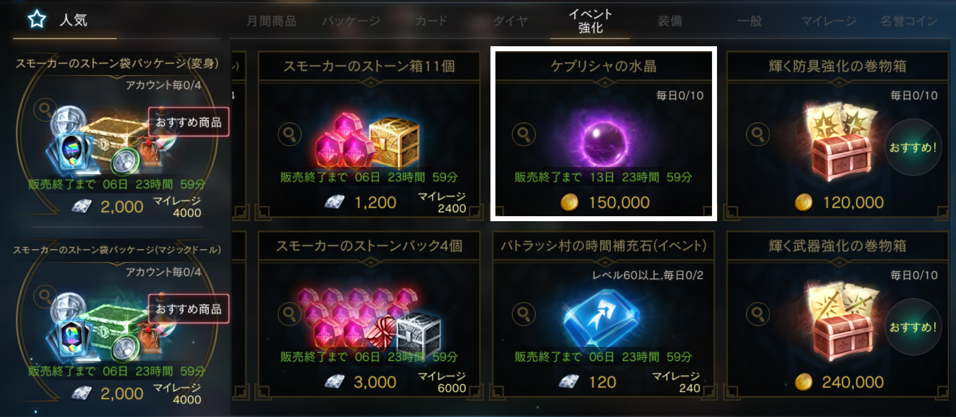 イベント期間中、ゲーム内ショップの「イベント強化」に「ケプリシャの水晶」が登場します。