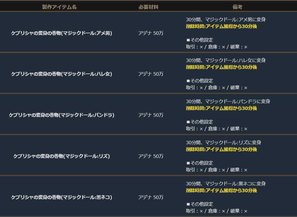 ケプリシャの変身の巻物の製作について追記しました。「ケプリシャの水晶」の再使用時間を撤廃しました。