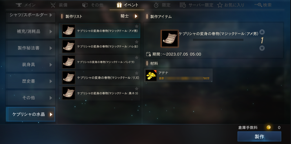 イベント製作にて、任意のケプリシャの変身の巻物を製作できます。