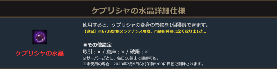 「ケプリシャの水晶」を使用すると、イベント期間限定の「ケプリシャの変身の巻物」を獲得することができます。