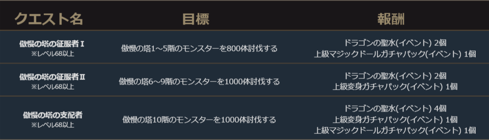 イベント期間中、デイリークエストをクリアすることで、上級ガチャパックやドラゴンの聖水などを獲得できます。
