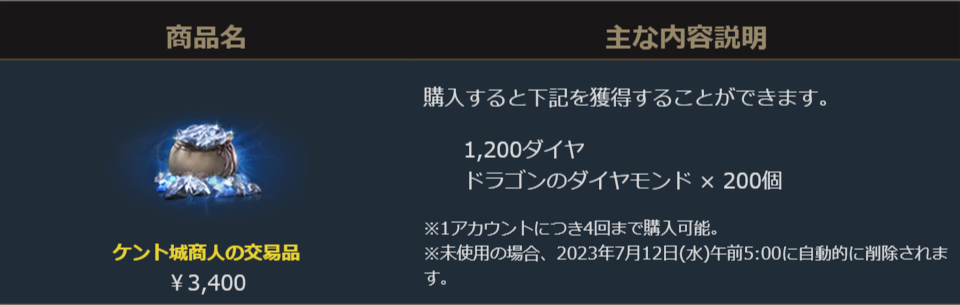 ダイヤ1,200個で3,400円という価格はそのままに、アインハザードの祝福を獲得出来る「ドラゴンのダイヤモンド」が付いてくるお得なパッケージです。
