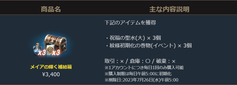 紋様の強化に使用する祝福ポイントが多く獲得できる「祝福の聖水(大)」と強化済みの紋様をリセットし強化に使用した祝福ポイントを取り戻すことができる「紋様初期化の巻物(イベント)」がそれぞれ複数セットになった、紋様強化に便利なパッケージです。