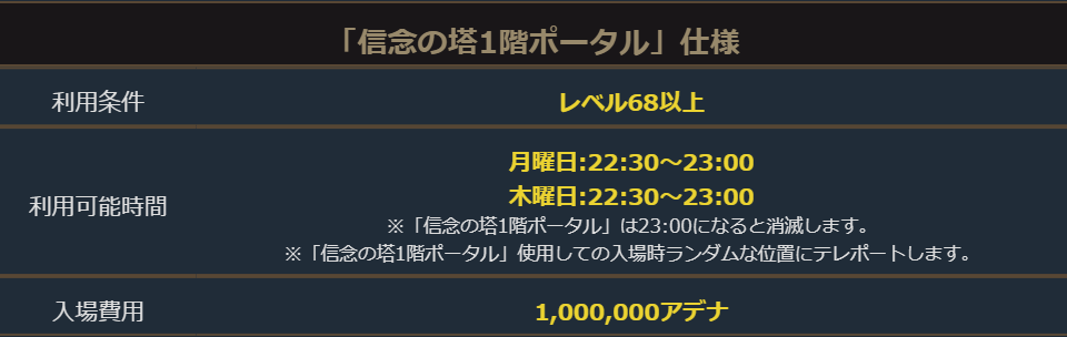 イベント期間中、月曜日と木曜日の22:30~23:00に「傲慢の塔と信念の塔入り口」のマップへ「信念の塔1階ポータル」が生成され入場がしやすくなります。