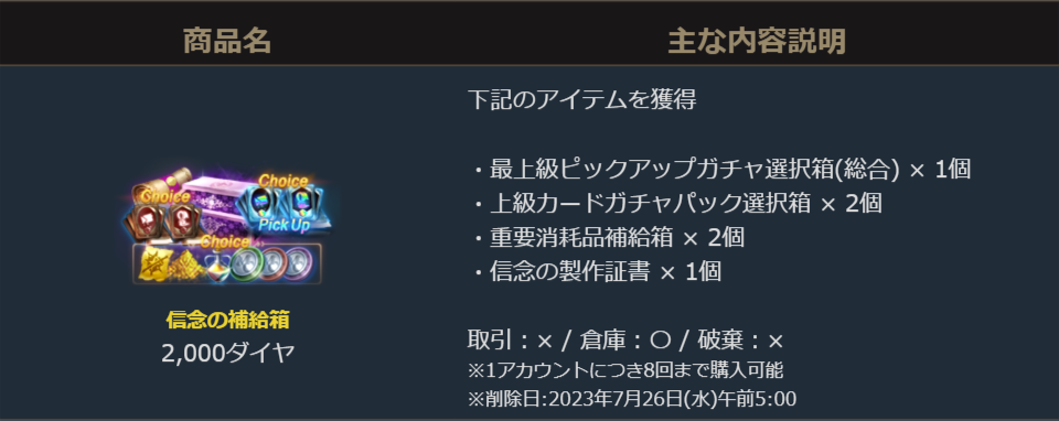 新たに登場した「最上級ピックアップガチャパック選択箱(総合)」と「重要消耗品補給箱」が一緒に獲得ができ、「上級カードガチャパック選択箱」も付いてくるパッケージです。