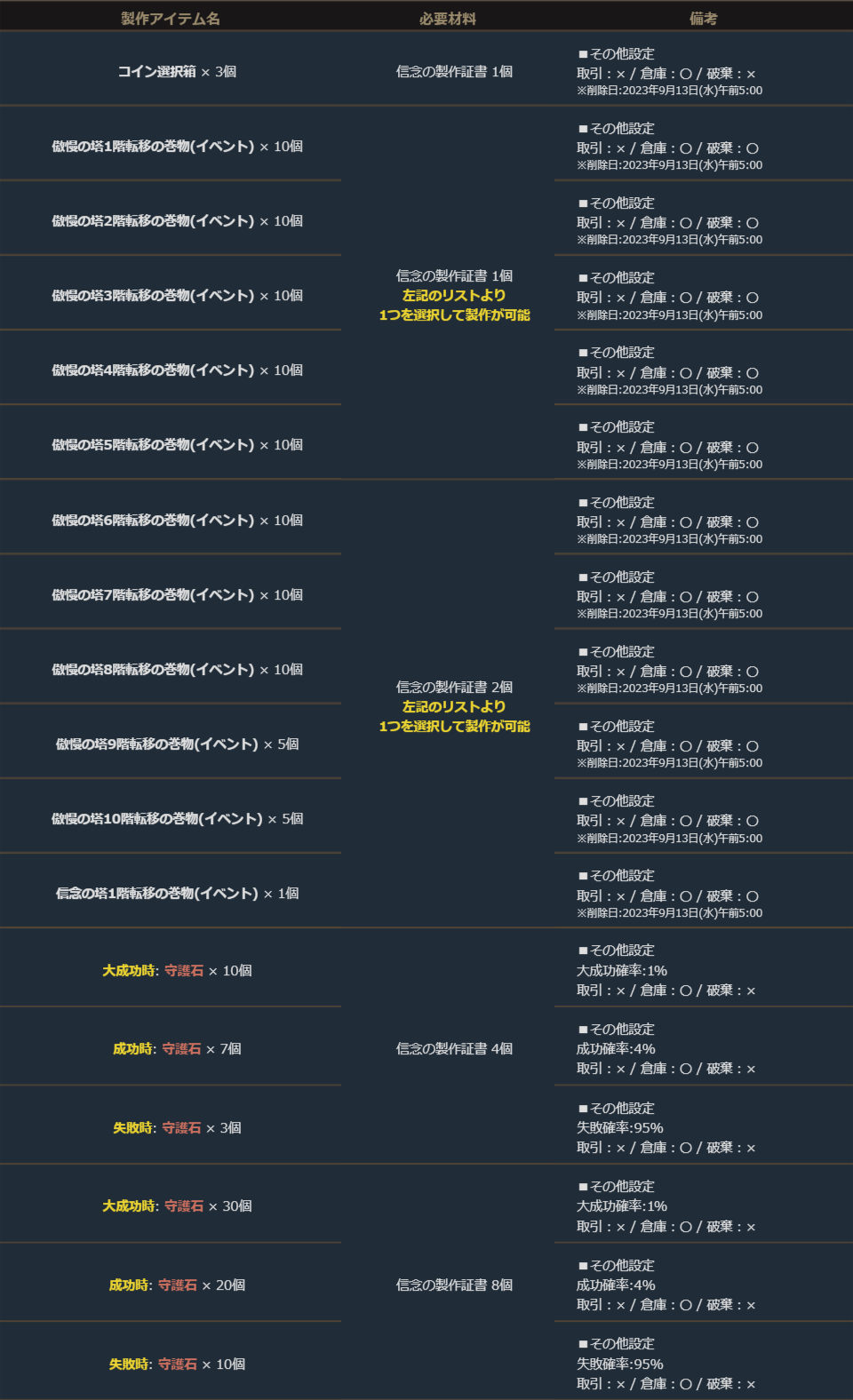 さらに、付属の「信念の製作証書」は「傲慢の塔1階~10階転移の巻物(イベント)」や「信念の塔1階転移の巻物(イベント)」の製作と製作の結果によって獲得出来る個数が変わる「守護石」の製作へのチャレンジが可能です。