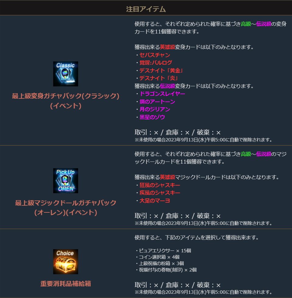 ※一部アイテムは未使用の場合、一定期間が経過すると自動で削除されます。詳しくは各アイテムの詳細をご確認ください。