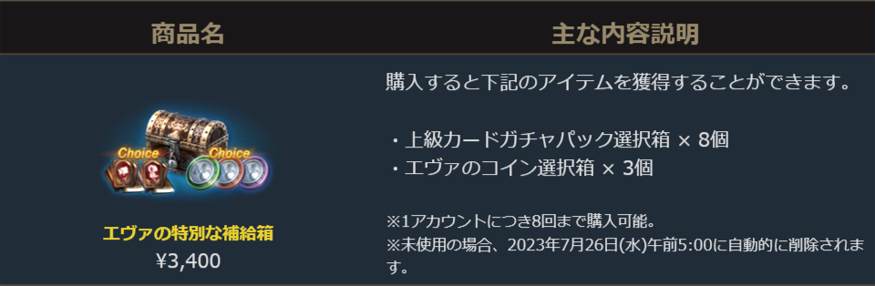 複数の「上級カードガチャパック選択箱」と一緒に選択したコインをたくさん手に入れる事が可能な「エヴァのコイン選択箱」が獲得できるお得なパッケージです。