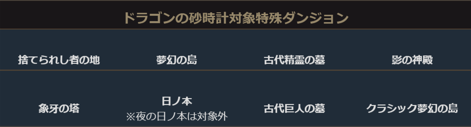 「ドラゴンの砂時計(イベント)」の対象の特殊ダンジョンは以下になります。