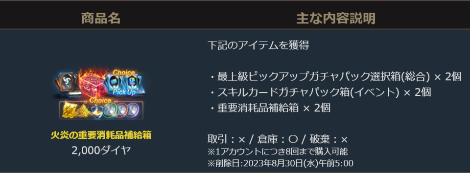 「最上級ピックアップ ガチャパック選択箱(総合)」と様々なアイテムを選択して獲得できる「重要消耗品補給箱」や「スキルカードガチャパック箱(イベント)」等の様々なアイテムが獲得出来るパッケージが登場しました。