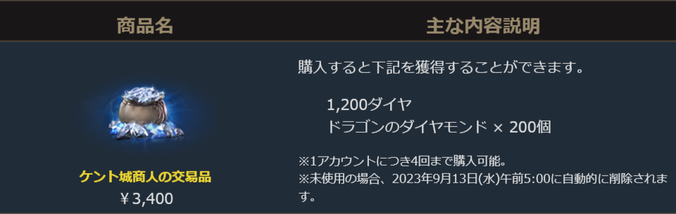 ダイヤ1,200個で3,400円という価格はそのままに、アインハザードの祝福を獲得出来る「ドラゴンのダイヤモンド」が付いてくるお得なパッケージです。