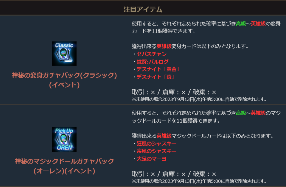 ※一部アイテムは未使用の場合、一定期間が経過すると自動で削除されます。詳しくは各アイテムの詳細をご確認ください。
