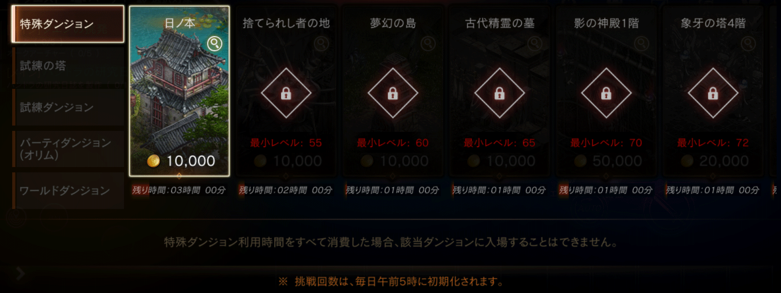特殊ダンジョン「日ノ本」への入場方法は、ゲーム内の「メニュー>ダンジョン>特殊ダンジョン」より、10,000アデナ消費することで入場可能です。