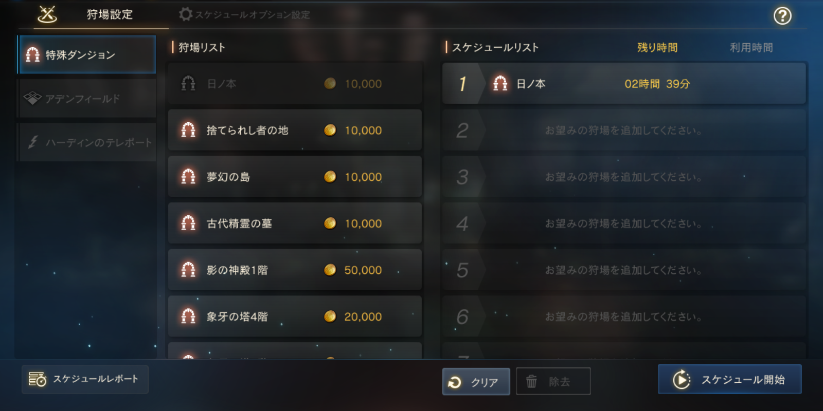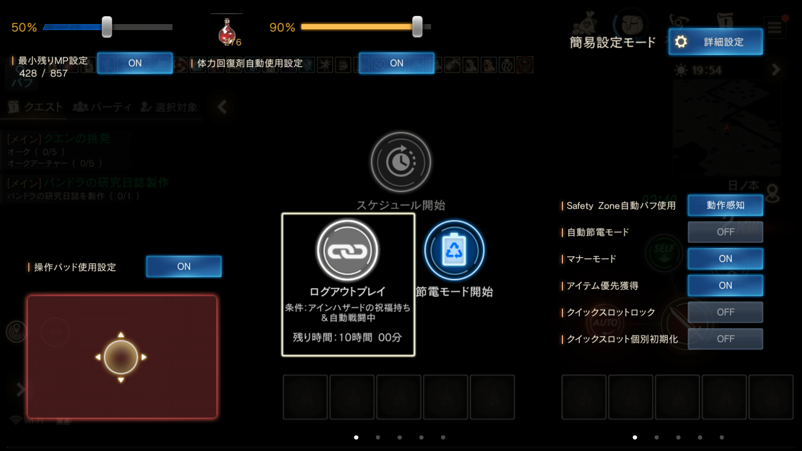 スケジュール機能は、予め「一括保管/一括売却/一括購入」設定を行ってから実行すると、端末を起動しておける状態であれば長時間狩りを自動で行うことが可能です。