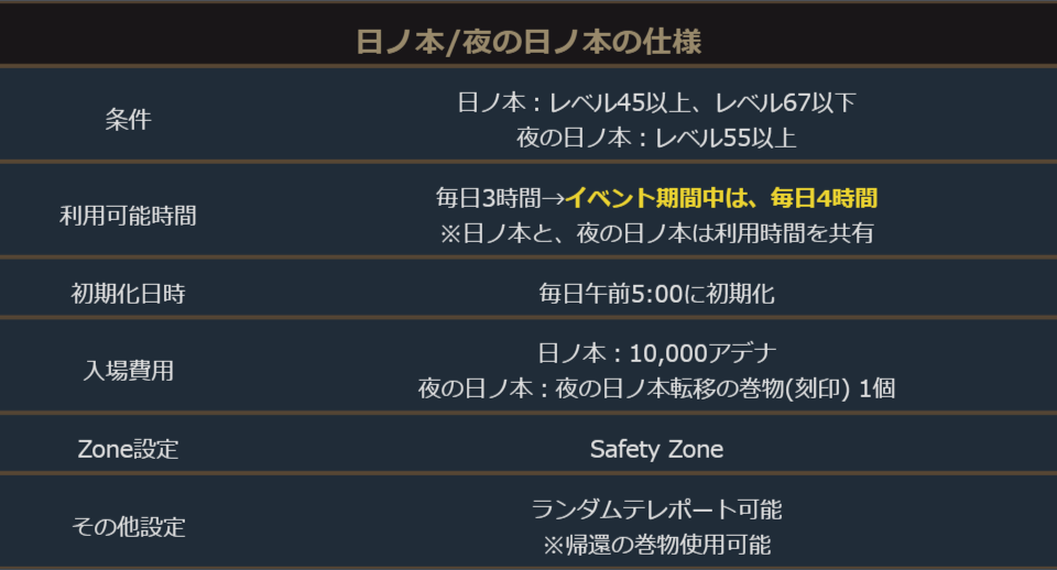 イベント期間中、特殊ダンジョン「日ノ本/夜の日ノ本」の利用時間を毎日4時間に延長します。