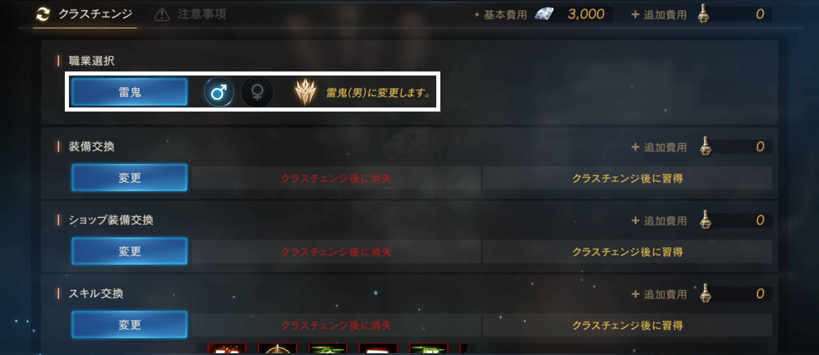 また、クラスチェンジ時に一部特定の装備やスキルを、選択した職業の装備やスキルに追加費用として「古代の成長ポーション」を支払うことで交換することができます。