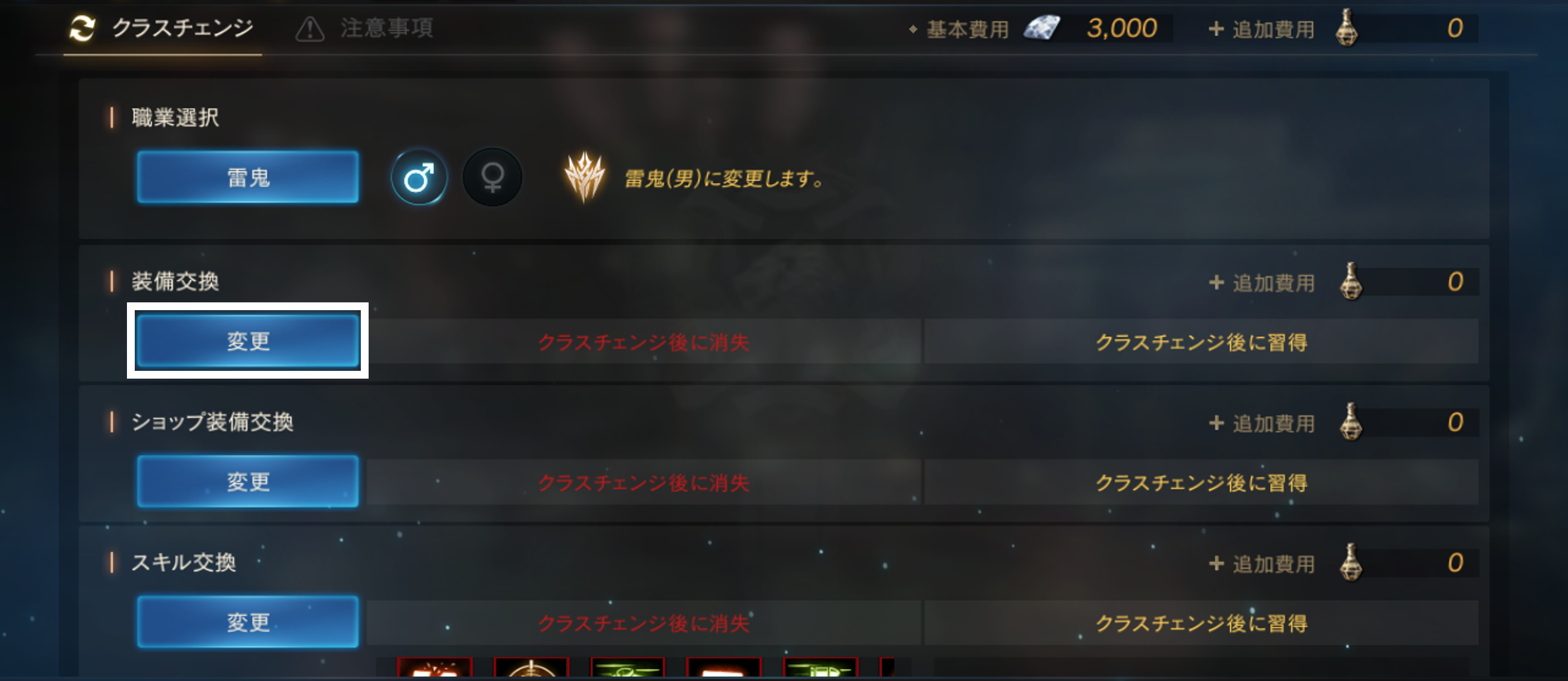 また、クラスチェンジの下記手続き以外では、装備やスキル交換は出来ませんので必ず忘れずに行ってください。