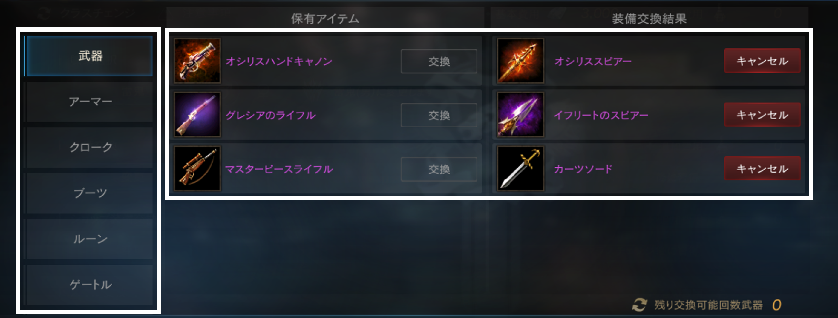 クラスチェンジを行う際に交換可能なアイテムは、希少級以上のクラスチェンジ前のキャラクターが装備可能なアイテムが対象となります。