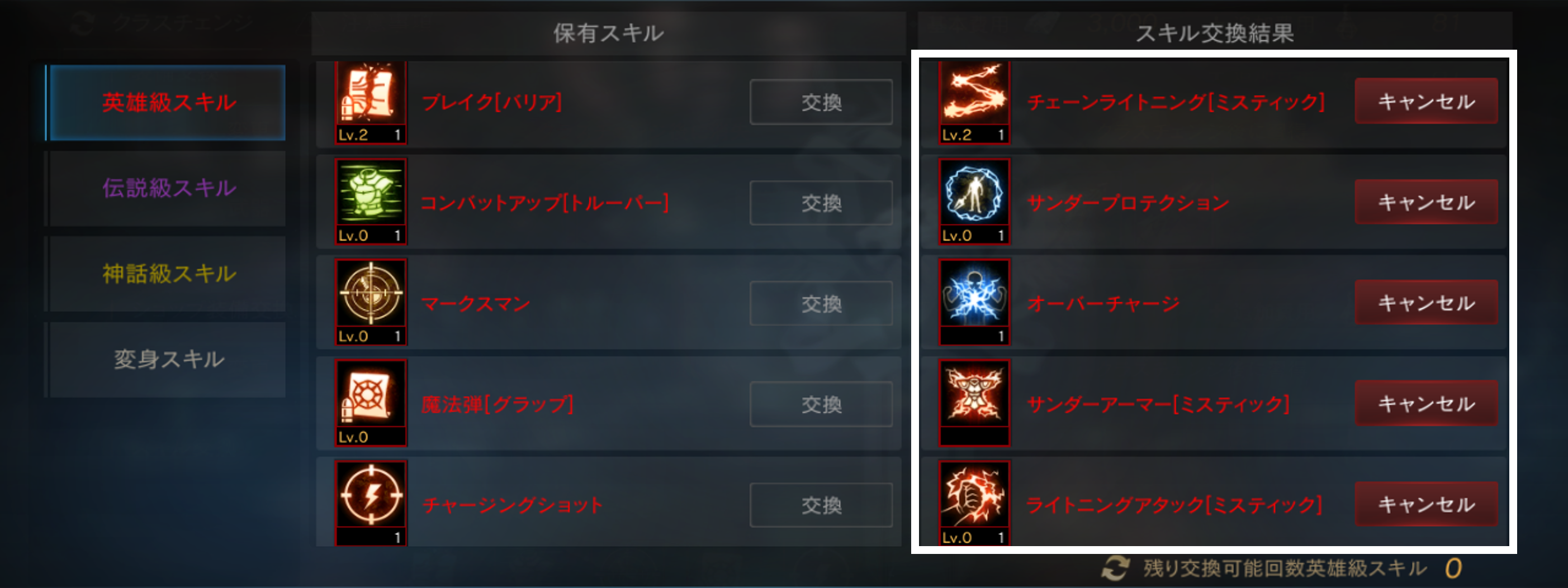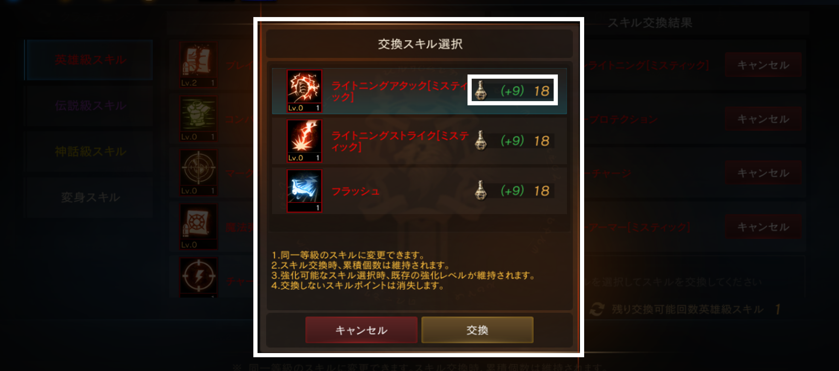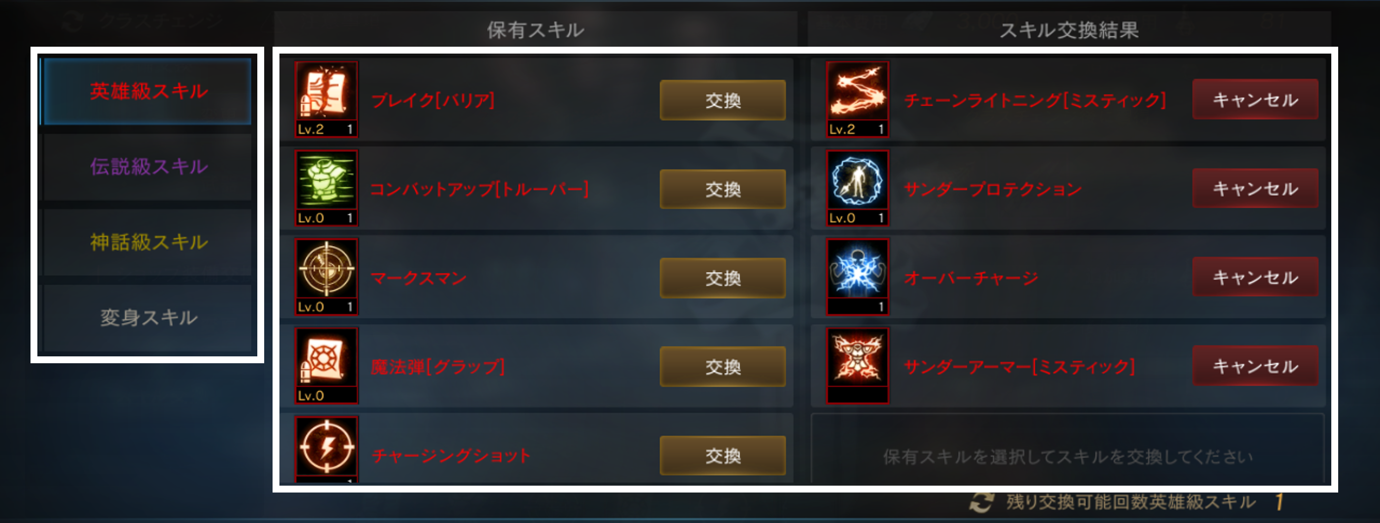 「英雄級スキル」と「伝説級スキル」は各等級ごとに最大で「5個」まで交換が可能です。