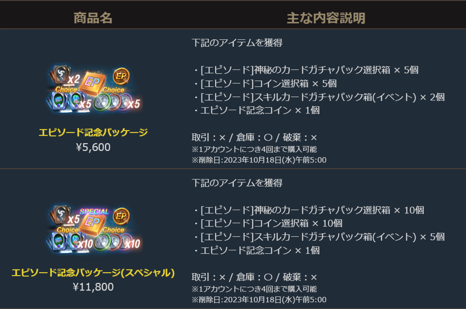 たくさんの神秘のカードガチャパック選択箱と一緒に、コイン選択箱、スキルカードガチャパック箱がセットになった2種類のお得なパッケージです。