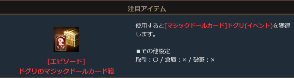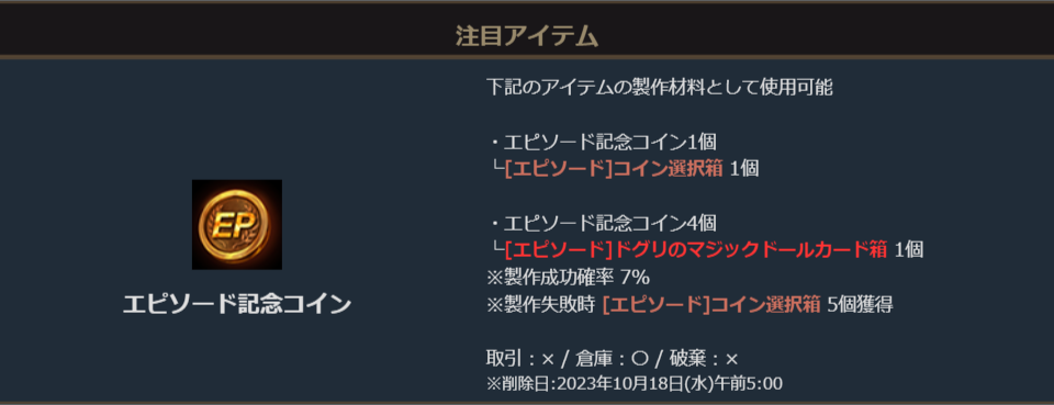 付属の「エピソード記念コイン」4枚で英雄級「[エピソード]ドグリのマジックドールカード箱」の製作に挑戦できます。