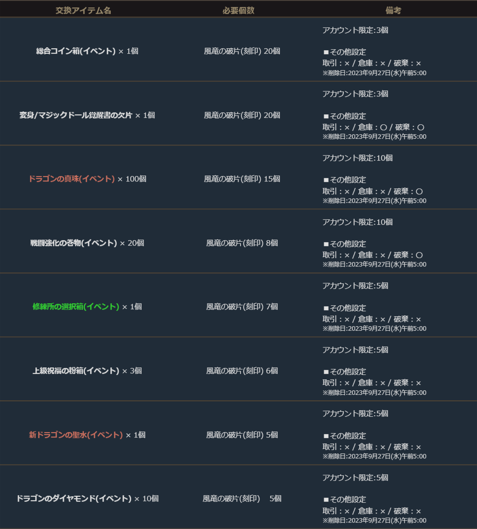 イベントクエストの報酬「風竜の破片(刻印)」を利用して製作メニューの「イベント>風竜の破片」より期間限定で様々なアイテムと交換が可能です。