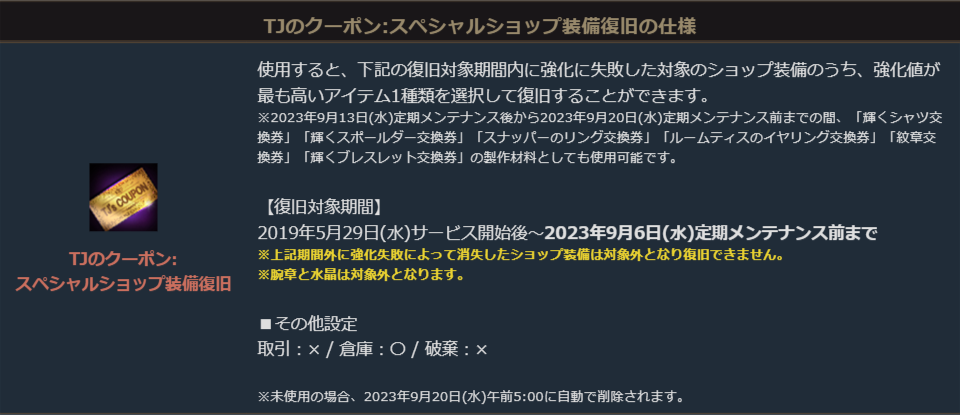 - TJのクーポン「スペシャルショップ装備復旧」:2019年5月29日(水)サービス開始後~2023年9月6日(水)定期メンテナンス前まで
