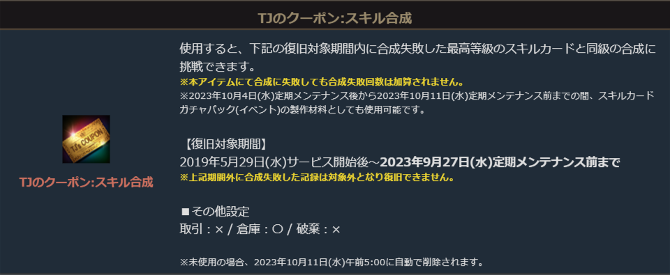 - 2023年10月4日(水)定期メンテナンス後:TJのクーポン「スキル合成」