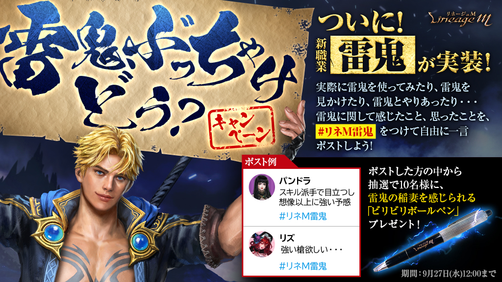 2.雷鬼についての感想をハッシュタグ「#リネM雷鬼」をつけてポスト(ツイート)
