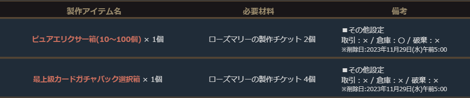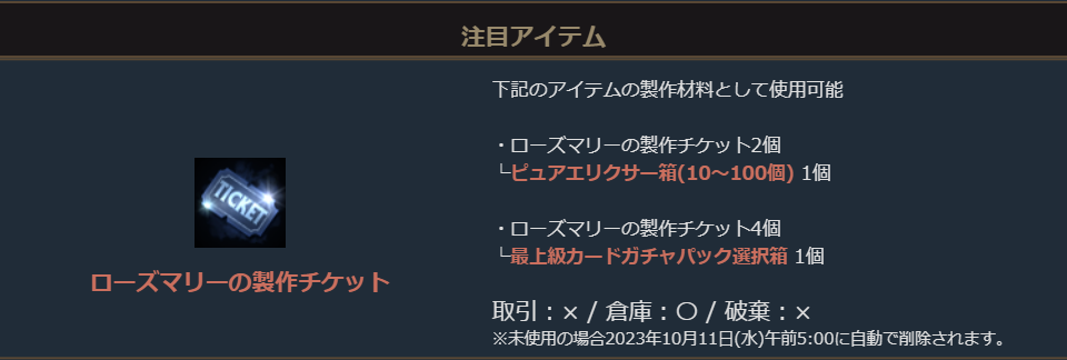 さらに、付属の「ローズマリーの製作チケット」を材料として「最上級カードガチャパック選択箱」や「ピュアエリクサー箱(10~100個)」の製作が可能です。