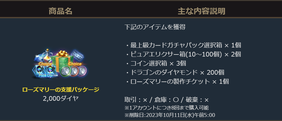 「最上級カードガチャパック選択箱1個」と「コイン選択箱3個」と一緒に「ドラゴンのダイヤモンド」等の様々な種類のアイテムが獲得出来るパッケージです。