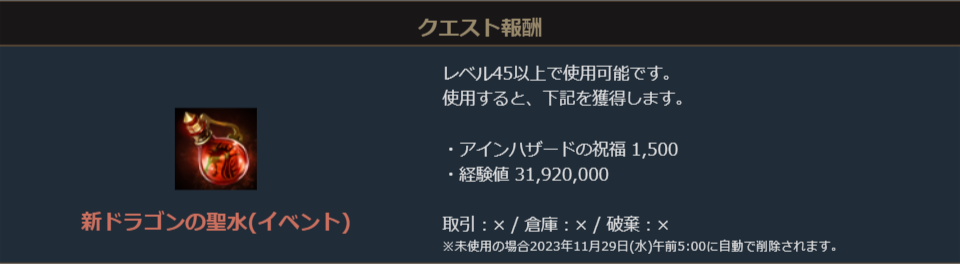 また、専用のデイリークエストが毎日配信されクエストをクリアする事で「新ドラゴンの聖水(イベント)」を3個入手可能です。