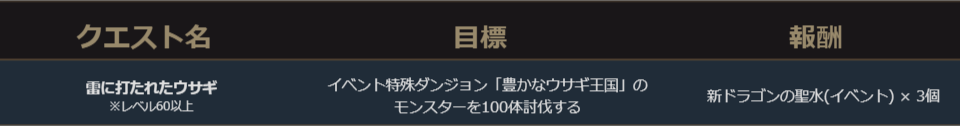 イベント期間中は、レベル60以上のキャラクターにデイリークエスト「豊かなウサギ王国」が付与されます。