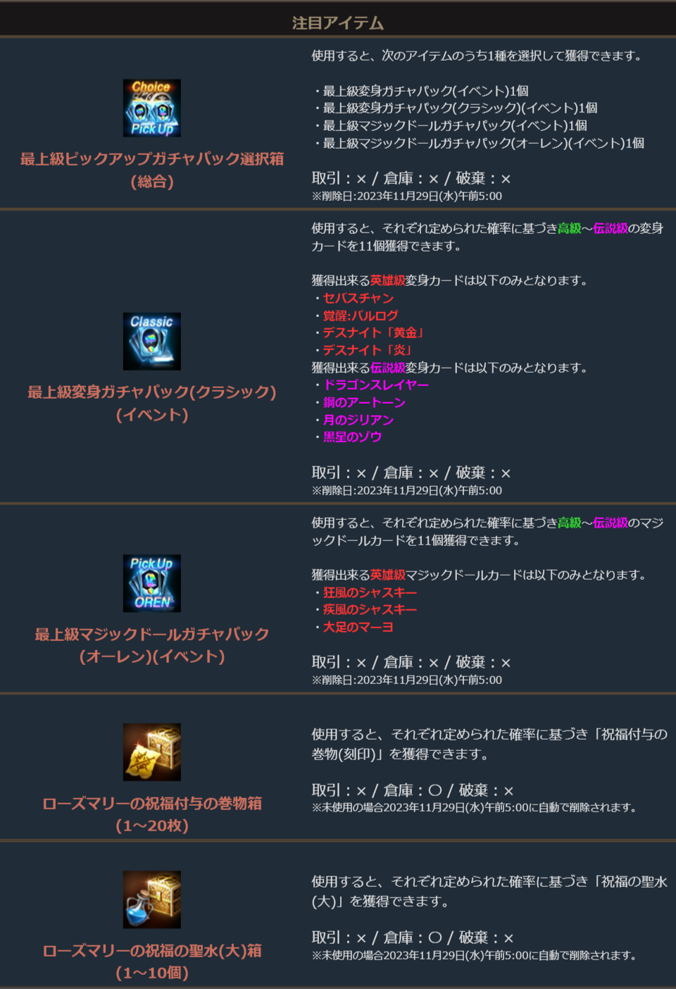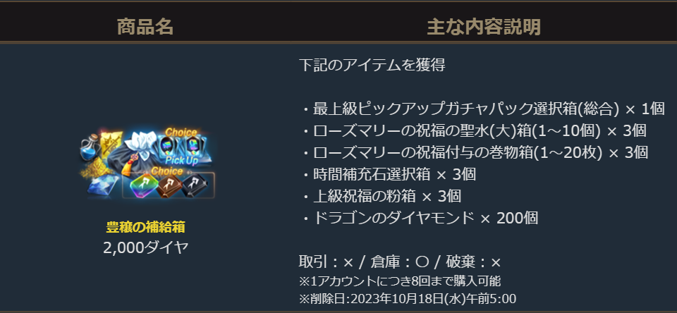 「最上級ピックアップガチャパック選択箱(総合)」に加え、「祝福の聖水(大)」を獲得出来る「ローズマリーの祝福の聖水(大)箱(1~10個)3個」と「祝福付与の巻物(刻印)」を獲得出来る「ローズマリーの祝福付与の巻物箱(1~20枚)3個」と一緒に「ドラゴンのダイヤモンド」等の様々な種類のアイテムが獲得できるパッケージです。