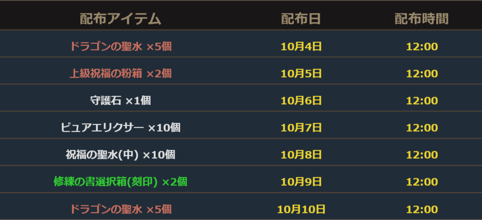 また、イベント期間中は下記のアイテムを毎日日替わりで配布致します。