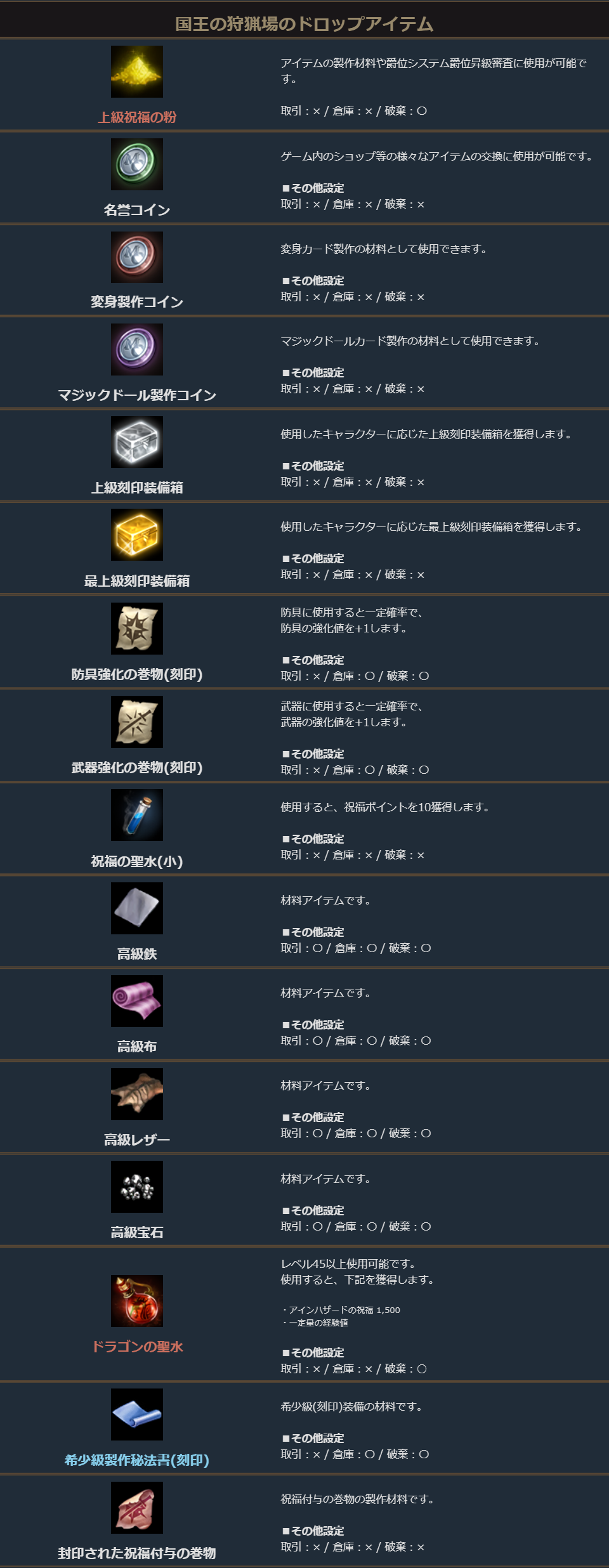 国王の狩猟場では、ドラゴンの聖水や希少級製作秘法書などがドロップします。