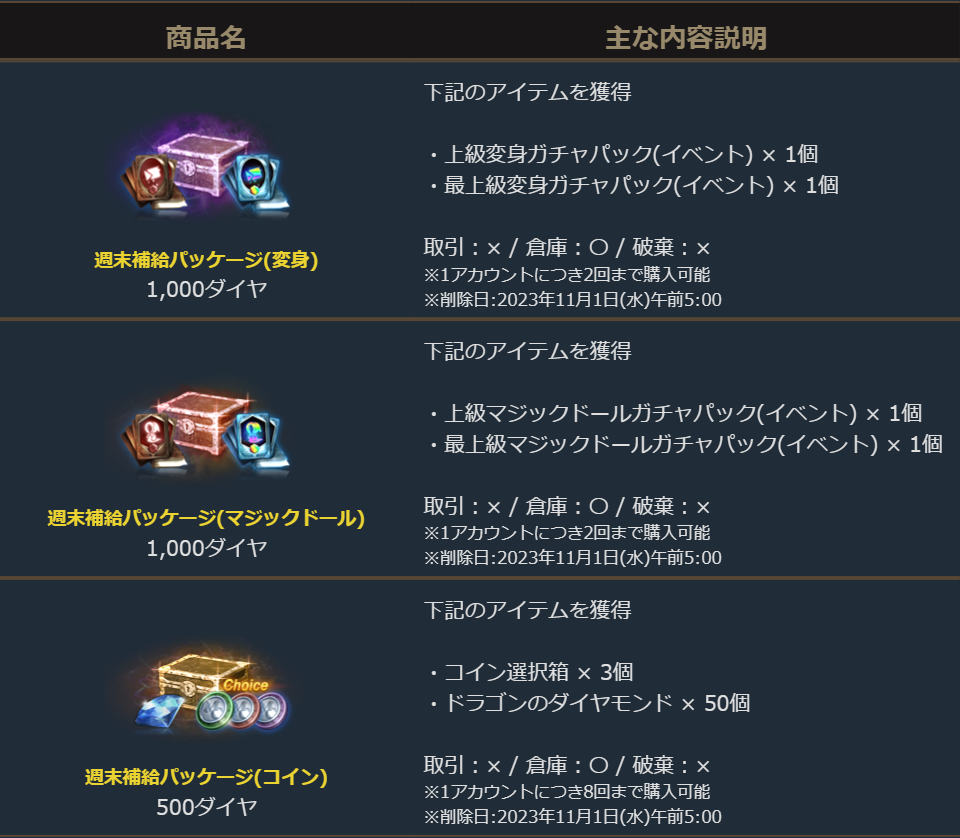 「コイン選択箱3個」と「ドラゴンのダイヤモンド50個」が獲得できる「週末補給パッケージ(コイン)」の3種類のお得なパッケージが登場しました。