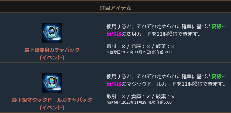 ※一部アイテムは未使用の場合、一定期間が経過すると自動で削除されます。詳しくは各アイテムの詳細をご確認ください。