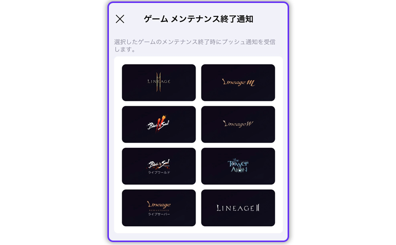 通知の設定をしていただきますと希望するゲームのメンテナンス終了通知を受け取ることができます。