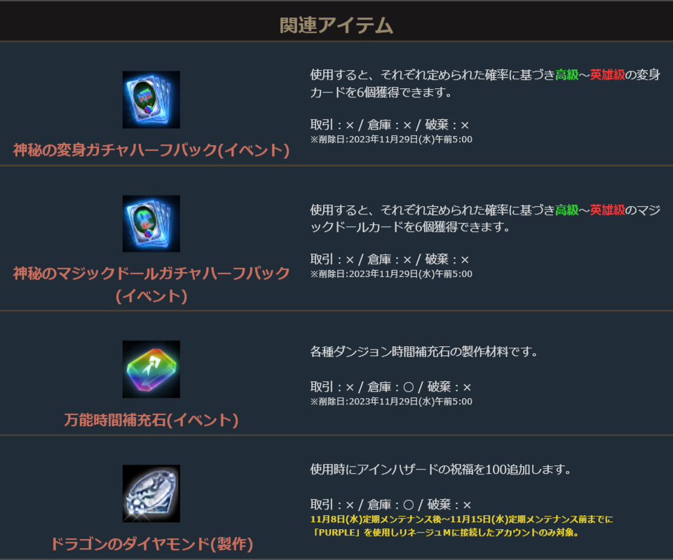 ※ドラゴンのダイヤモンド(製作)は11月8日(水)定期メンテナンス後~11月15日(水)定期メンテナンス前までに