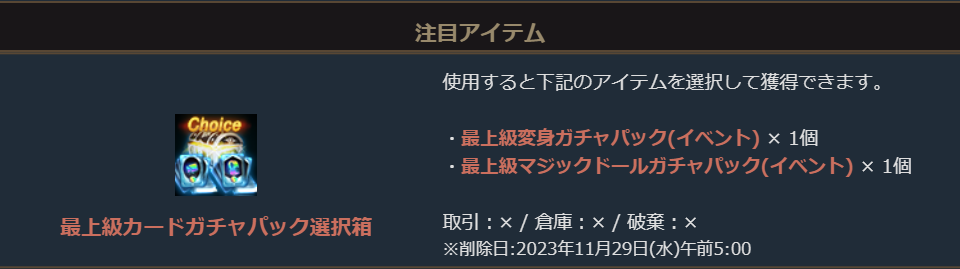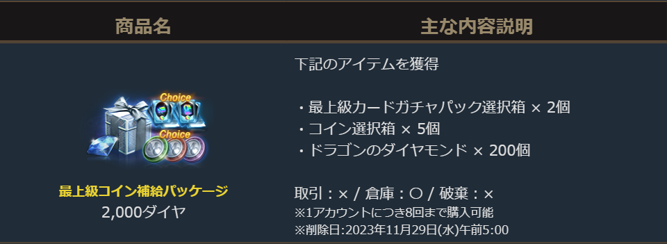 「ドラゴンのダイヤモンド200個」と「コイン選択箱5個」に加え、「最上級カードガチャパック選択箱」が2個獲得できるお得なパッケージです。