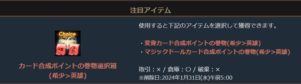 「ドラゴンのダイヤモンド」と「ドラゴンの聖水(イベント)」と一緒に合成ポイントを増加させる事が可能な「カード合成ポイントの巻物選択箱(希少>英雄)」を獲得できるパッケージです。